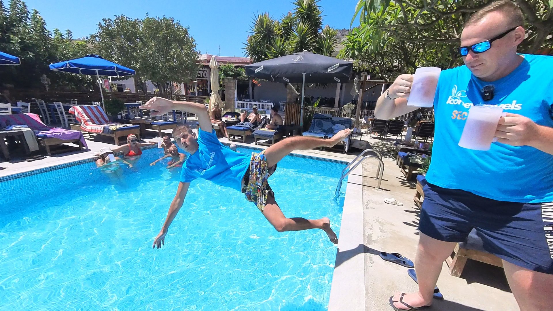 A glimpse of sunny pool days, delicious food, refreshing drinks, and great times with friends in Pefkos.